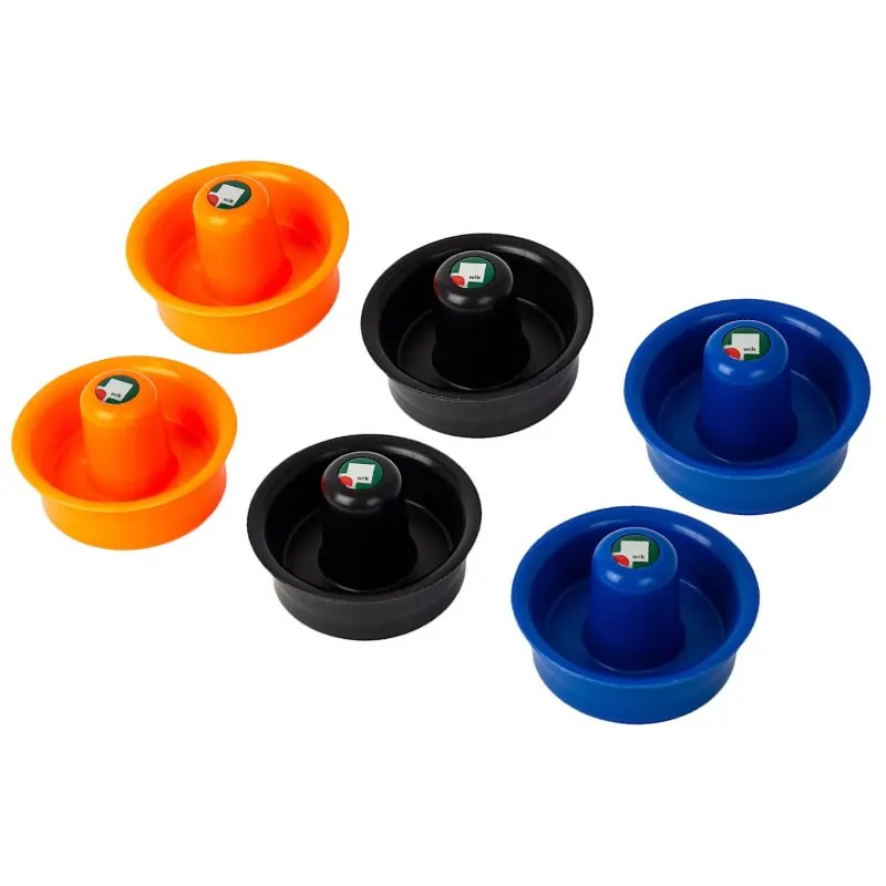 Zestaw 6 oryginalnych odbijaków do air-hockey'a, od spodu pokryty filcem. Dostępny w kolorze czarnym, pomarańczowym (fluorescencyjnym) i niebieskim.