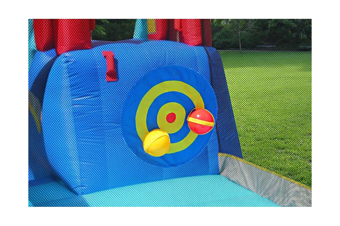 - Wszystkie przezroczyste części zamku są zabezpieczone solidną siatką, co zapewnia dodatkowe bezpieczeństwo podczas zabawy.