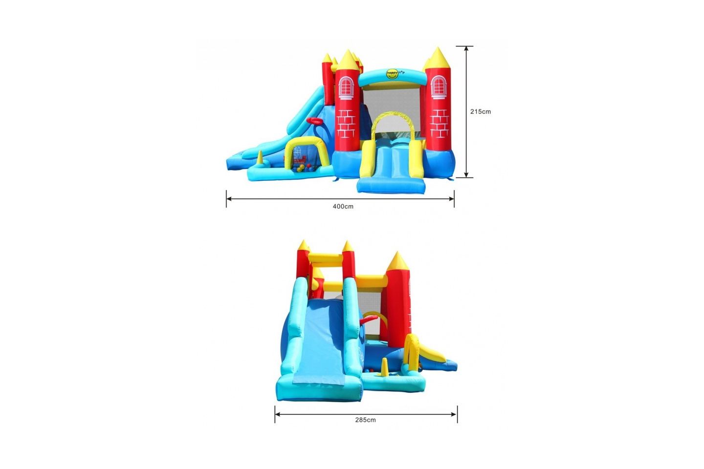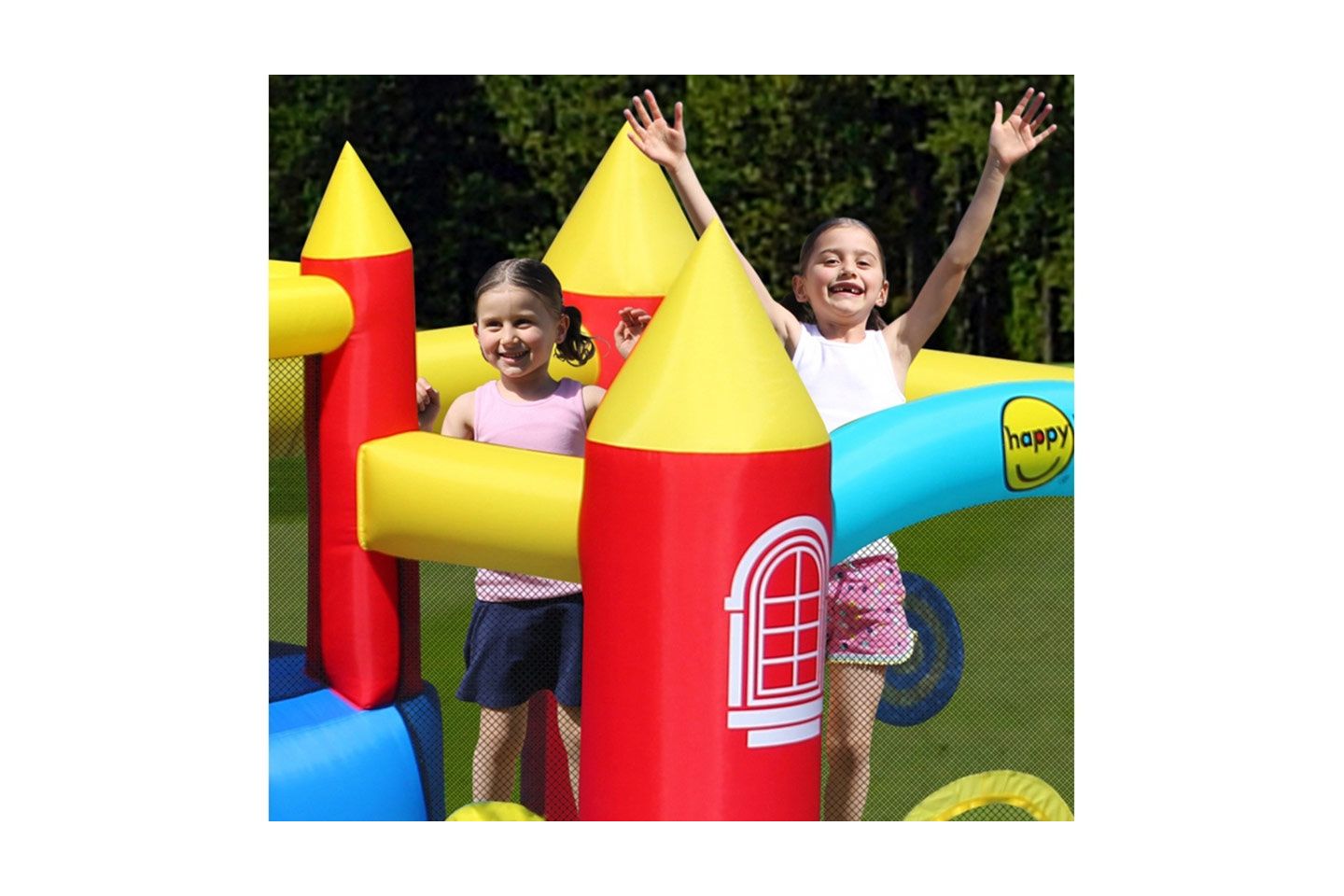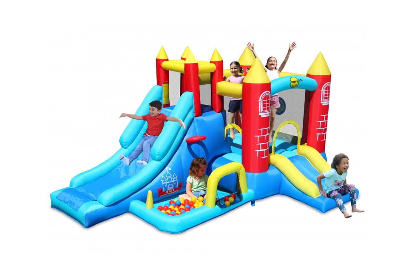 Dmuchany zamek 8w1 Centrum Zabaw Happy Hop to niezawodny sposób na zapewnienie dzieciom godzin pełnych radości i aktywności! Wyposażony w aż 8 różnorodnych atrakcji, takich jak skakanie, zjeżdżanie, wspinanie czy zabawa w baseniku z piłeczkami, dmuchaniec gwarantuje wszechstronną zabawę w jednym urządzeniu. Dzięki zastosowaniu solidnej siatki zabezpieczającej opiekunowie mogą być spokojni o bezpieczeństwo swoich pociech.
