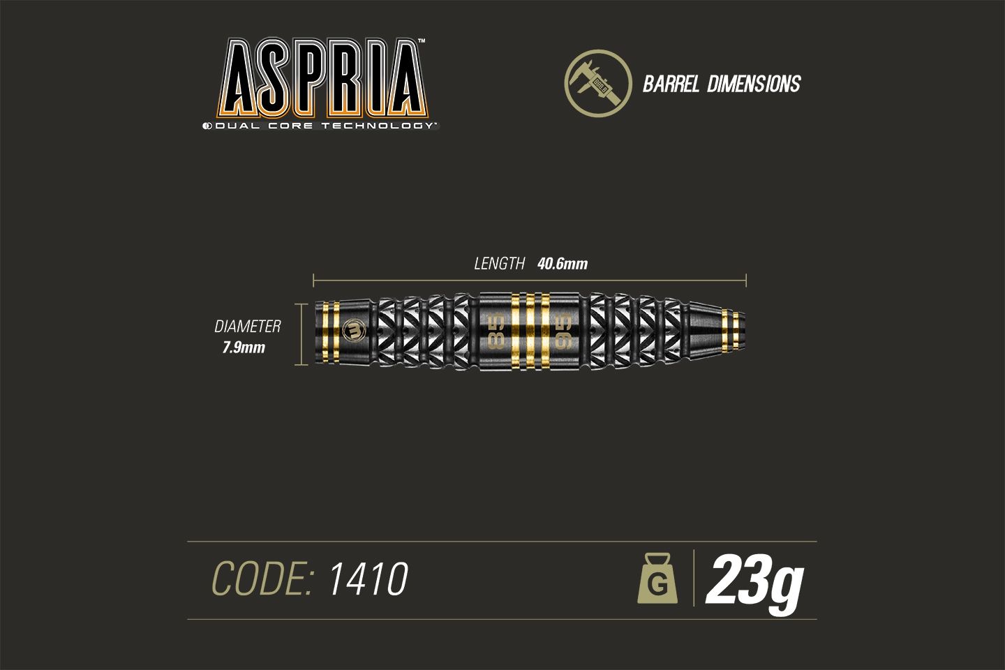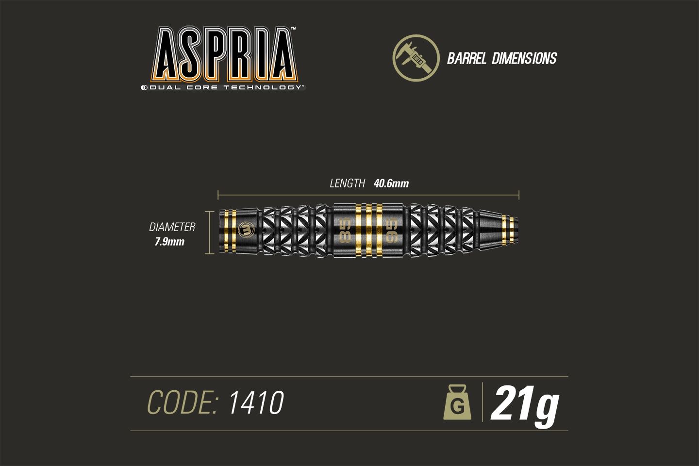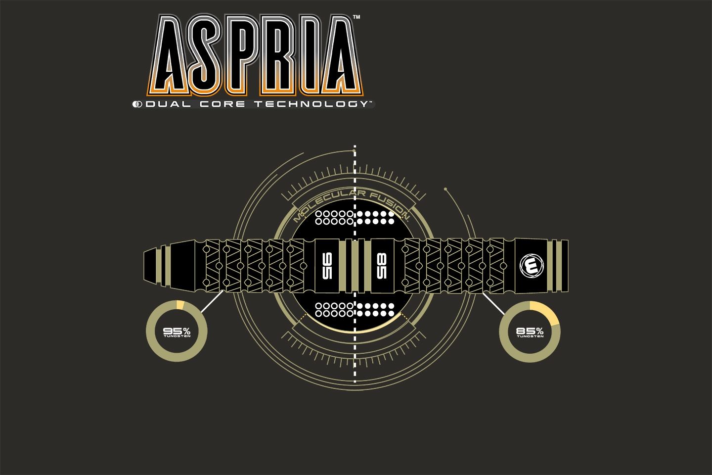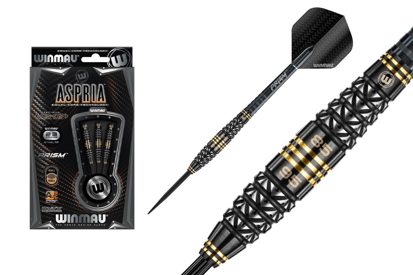 Rzutki Winmau ASPRIA to doskonałość w każdym calu — dwurdzeniowy barrel 95/85% wolfram, z agresywnym gripem AXIS został obrobiony w najnowszej technologii CAD CAM. Dodatkowo zostały wykończone oryginalnym Genuine Gold i powłoką Onyx.