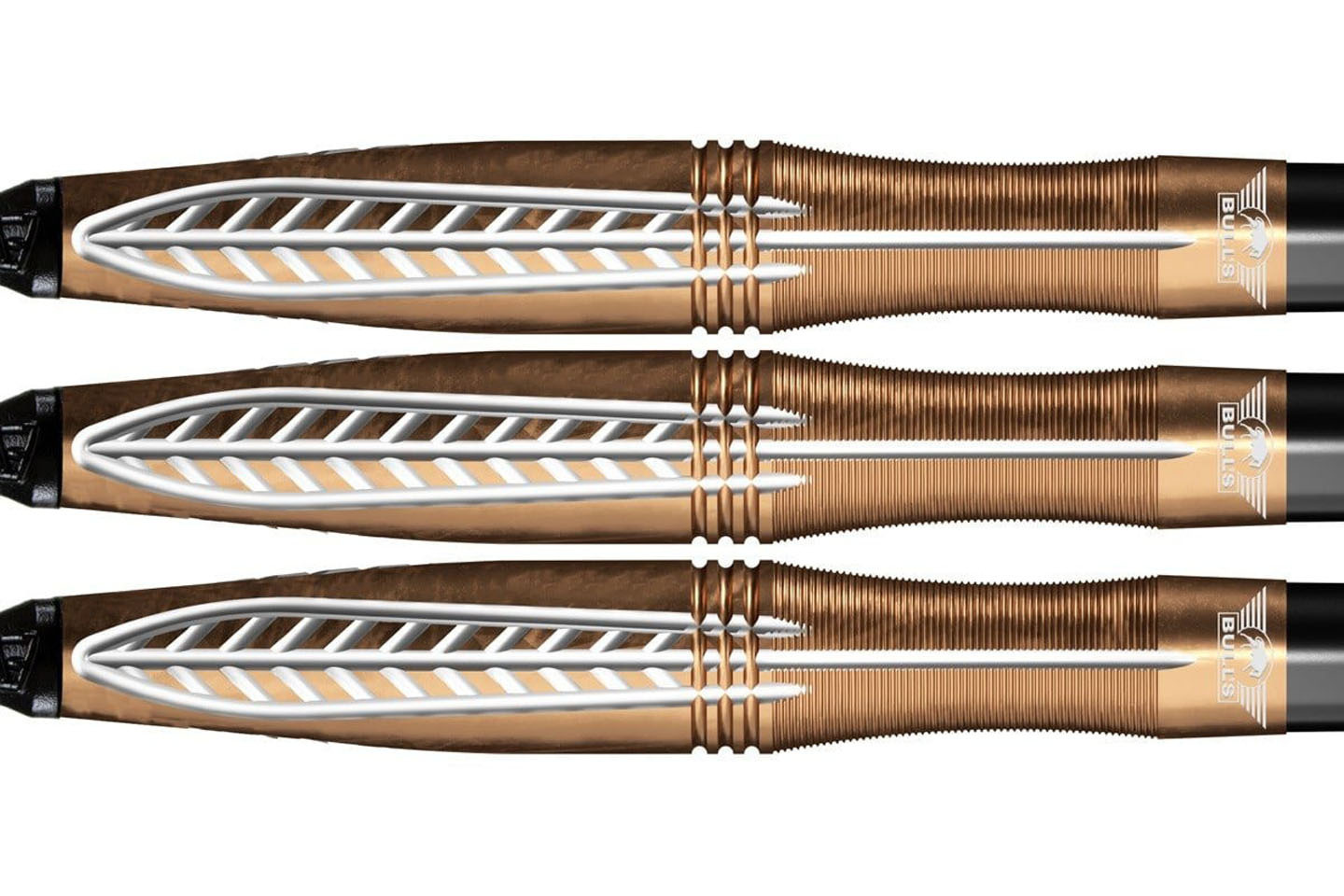 Barrel charakteryzuje się stożkowym przodem i zakrzywioną tylną częścią, co zapewnia naturalne wyważenie i komfortowy chwyt. Na całej długości barrela zastosowano delikatny wzór przypominający pióra oraz mikro‑ringowane segmenty, które poprawiają kontrolę nad lotką i stabilność rzutu. Stylowe wykończenie w odcieniach brązu i srebra przyciąga uwagę i podkreśla profesjonalny charakter zestawu.