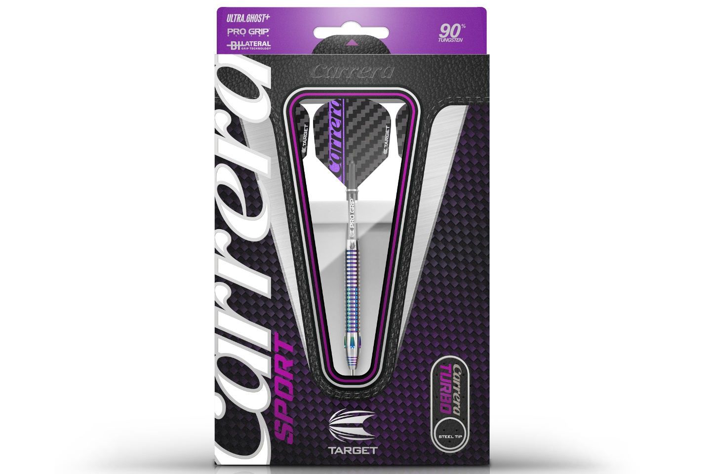 Klasyczne lotki Carrera otrzymały teraz bardziej sportowy wygląd. Carrera Sport zostały pokryte polichromowaną powłoką z azotku tytanu oraz są wyposażone w obustronny chwyt, który będzie odpowiedni zarówno dla osób, które wolą trzymać lotkę bardziej z przodu jak i dla tych, którzy preferują chwyt z tyłu barrela. Zestaw zawiera shafty Pro Grip, oraz piórka w technologii Ultra Ghost+.