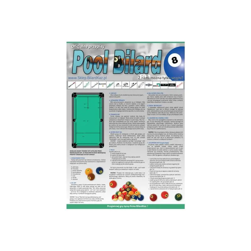 Na plakacie w przystępny sposób zostały opisane zasady gry oraz popularne mity bilardowe, oraz częste błędy, które są popełniane przez niedoświadczonych graczy. Plakat jest przejrzysty i czytelny, wydrukowany na papierze wysokiej jakości świetnie sprawdzi się wszędzie tam, gdzie stoi stół bilardowy.