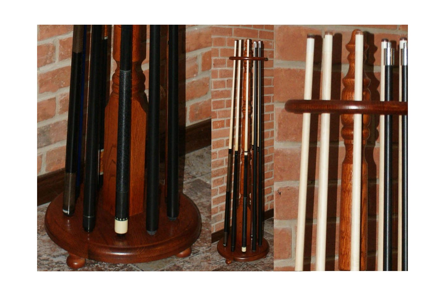 Drewniany stojak toczony przeznaczony na 10 kijów. Doskonale komponuje się ze stołami na nogach toczonych, dostępny w kolorach stołów bilardowych.