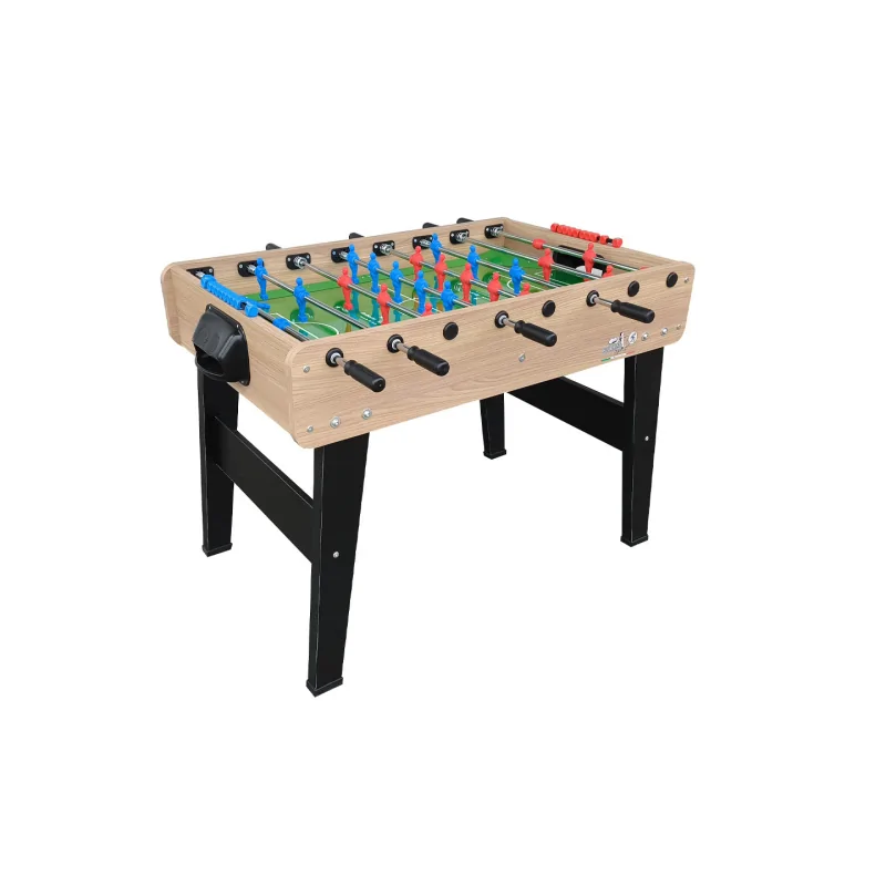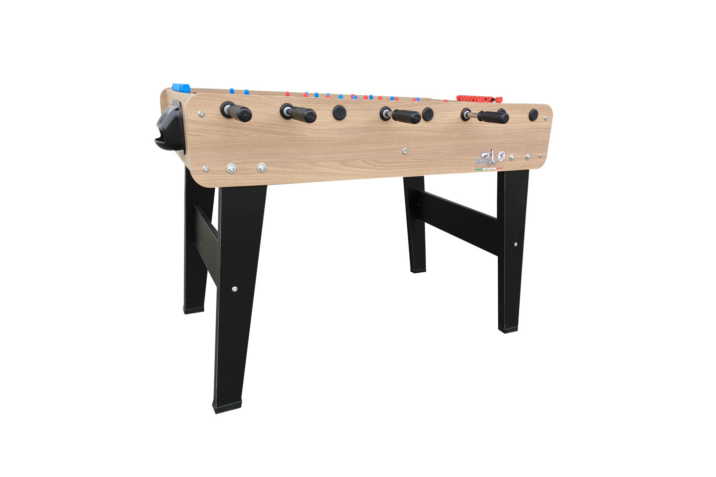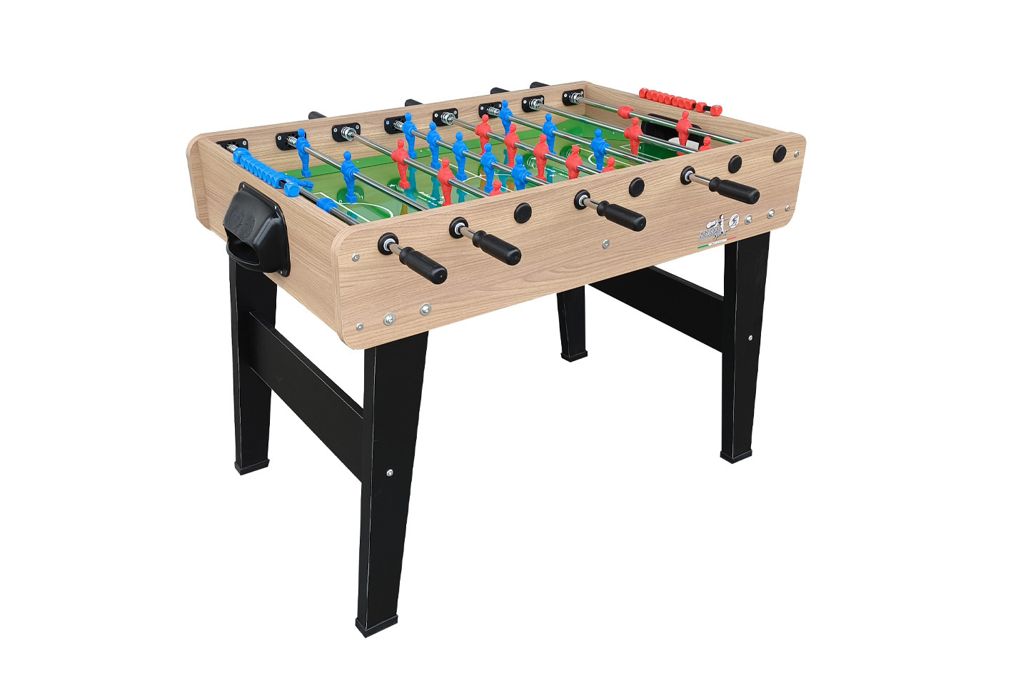 Obudowa w naturalnym kolorze drewna podkreśla klasyczny styl stołu, a drewniane nogi wzmocnione poprzeczną belką gwarantują stabilność podczas intensywnych rozgrywek. Hartowane szkło na powierzchni boiska chroni je przed uszkodzeniami i zapewnia płynną grę, a bezpieczne teleskopowe drążki zwiększają komfort użytkowania.