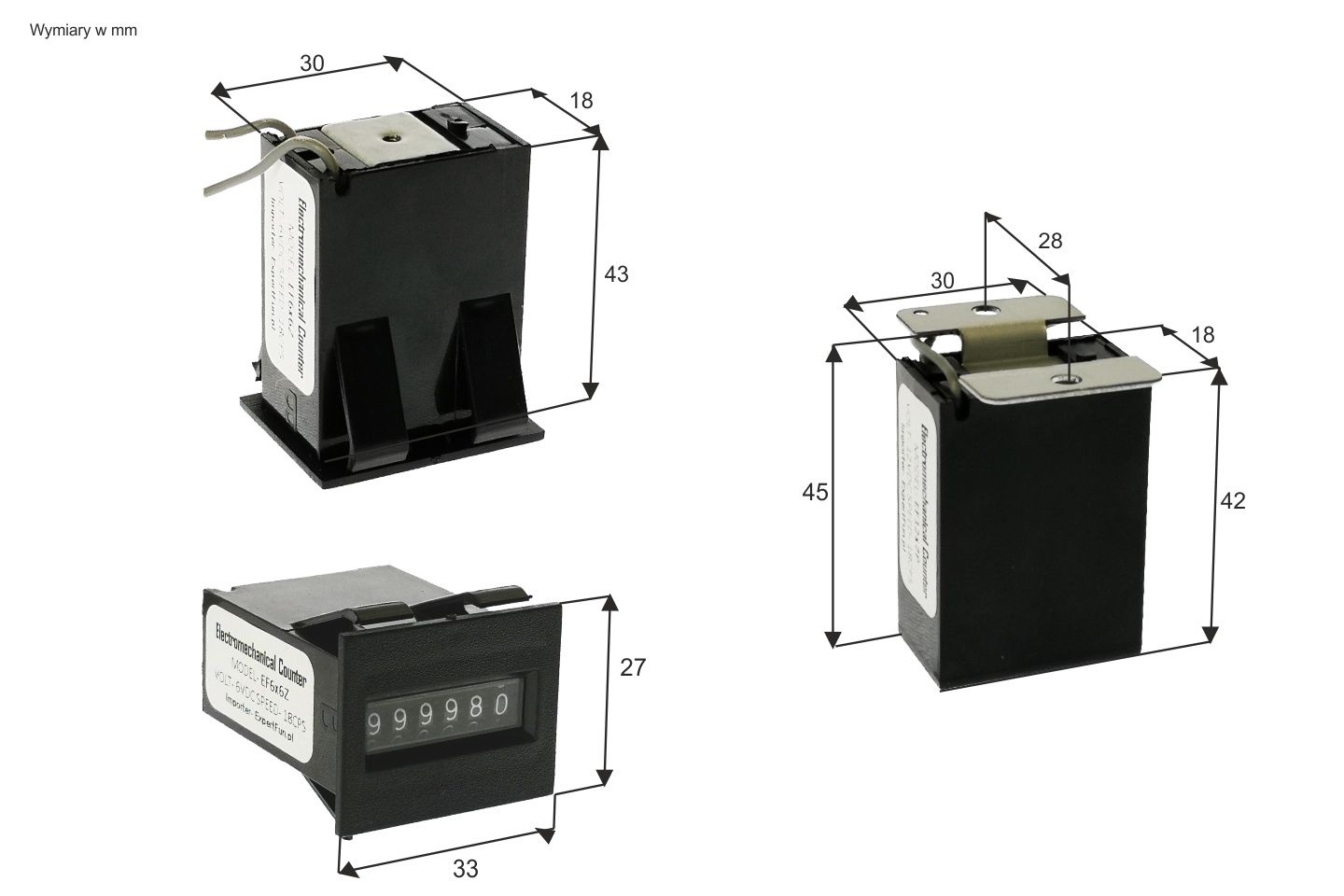Mechaniczny licznik impulsów elektromagnetycznych z cewką o zakresie napięcia 6V–12V. Licznik zwiększa wartość po odebraniu sygnału elektromagnetycznego i nie posiada przycisku zerowania, co umożliwia rejestrowanie skumulowanej liczby impulsów.