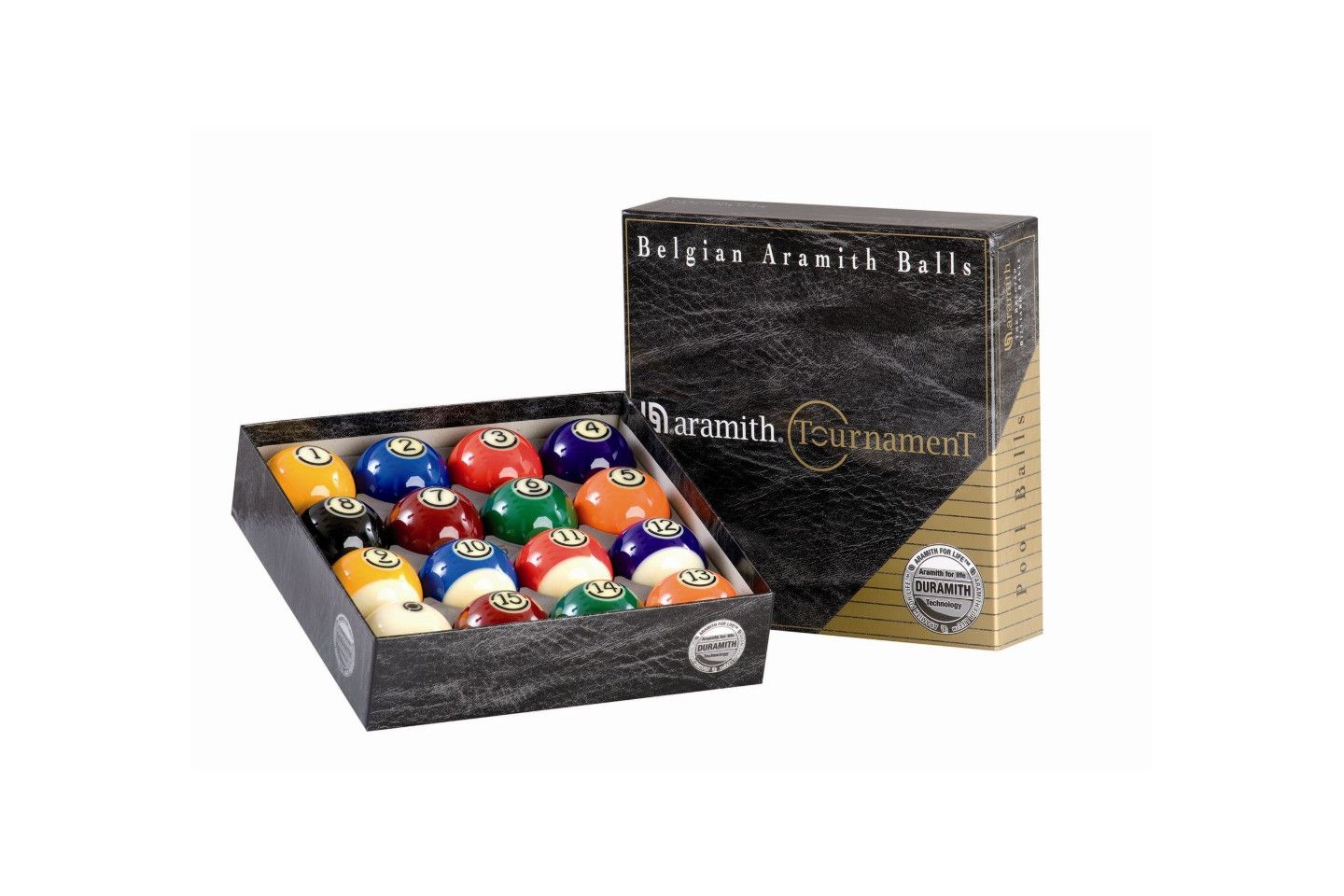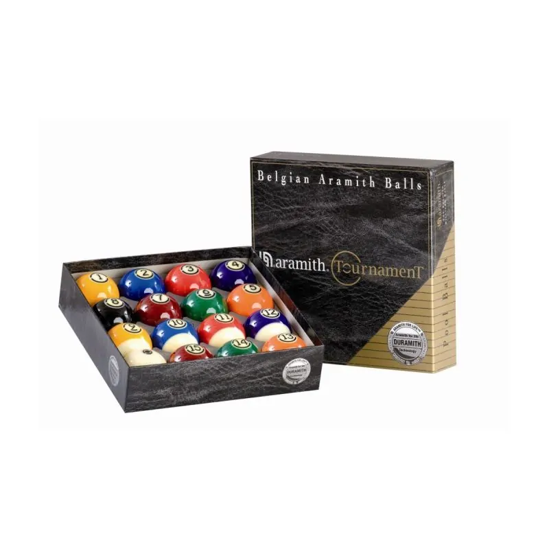 Komplet Aramith Tournament Pool został wykonany w nowej technologii Duramith. Specjalnie zaprojektowana molekularna struktura żywicy radykalnie zwiększa żywotność bil, minimalizując jednocześnie zużycie sukna.