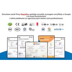 Wszystkie dmuchańce Happy Hop są certyfikowane i zgodne z normami bezpieczeństwa: EN71, RoHS, GS, CE, EMC, BS